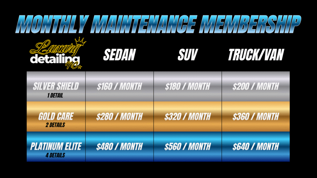 Our Monthly Maintenance Membership is designed to keep your vehicle consistently clean, protected, and looking its best without the need for repeated full details. This program is perfect for clients who value convenience, long-term vehicle care, and a premium appearance all year round.